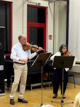 Der Abend klang aus mit vielen Nachfragen der Anwesenden an die beiden Künstler und wurde mit festlicher Barockmusik für zwei Violinen beendet.